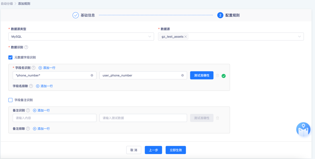敏感字段识别数据完成采集后,可能会存在一些敏感字段,例如手机号、地址、身份证号信息等用户个人隐私数据,企业可根据本身的行业属性指定敏感字段分类标准,平台提供敏感字段识别规则配置入口,可依据字段的特性进行范围识别。