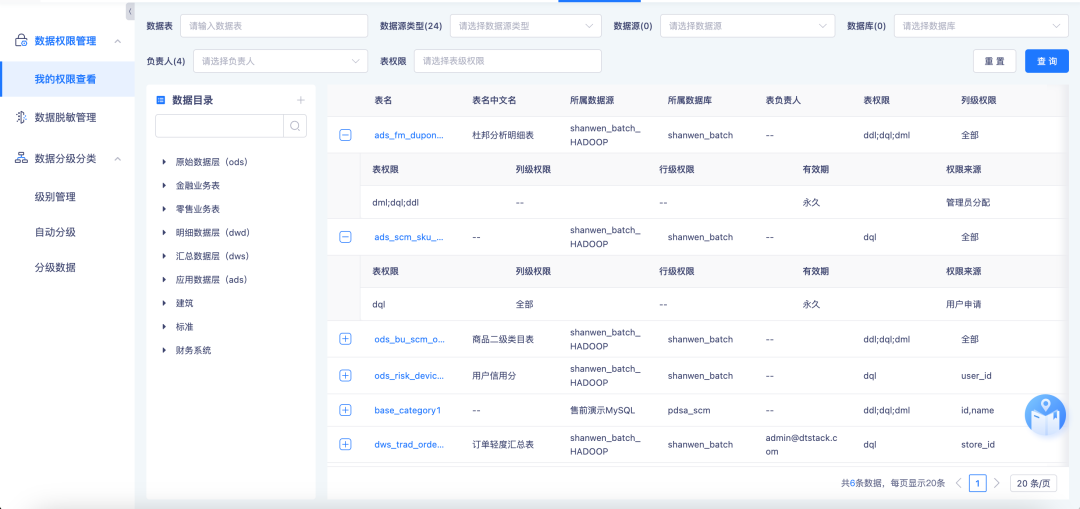 数据权限管控是数据安全管控中极为重要的一环,做好数据权限的控制,可以有效防止数据泄漏、数据篡改等风险问题。平台提供从数据权限分配、权限申请、权限审批、权限回收、个人权限查看的完整权限管理链路,支持进行数据表的dql、ddl、dml以及行、列级别的操作权限控制以及权限有效期设置,全方位、细粒度实现数据权限控制。