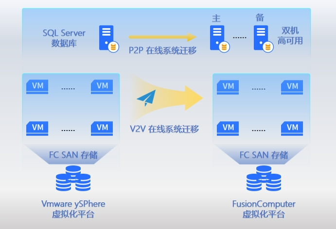 某学校需要将财务系统近百台虚拟机(包括Windows、Linux系统)从VMware vSphere平台迁移到华为FusionComputer虚拟化平台,同时还需要将一台SQL Server数据库迁移至两台新的物理服务器,构建双机主备架构。跨平台和跨版本的兼容性问题,尤其是高可用架构的搭建,要求迁移过程中确保数据一致性和系统稳定性,这是技术团队面临的核心难题。