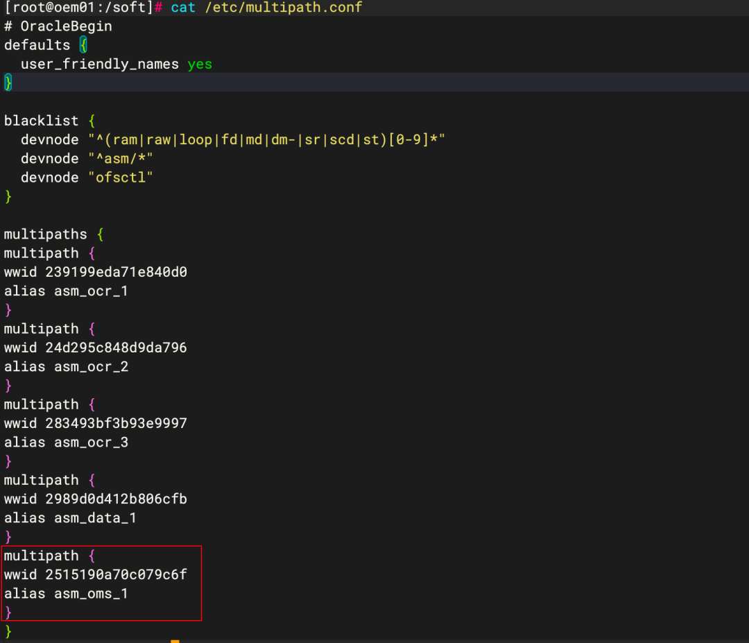 编辑 multipath 配置文件,添加 OMS 专用共享磁盘: