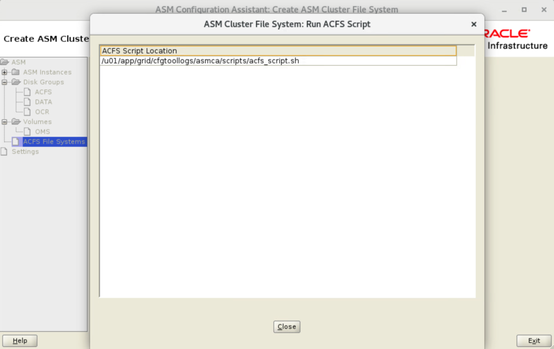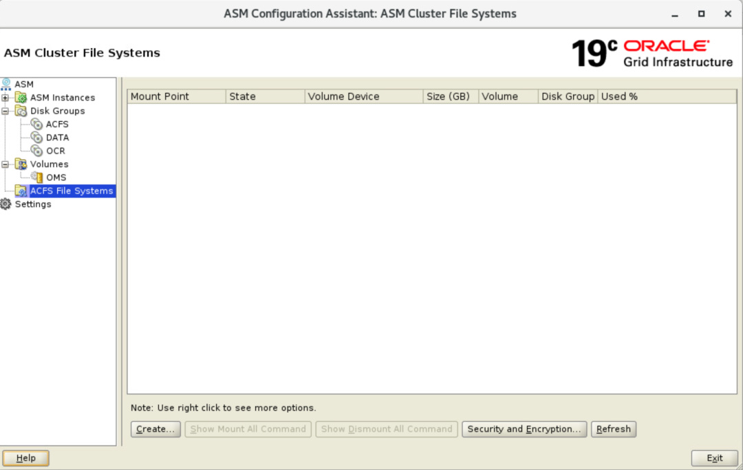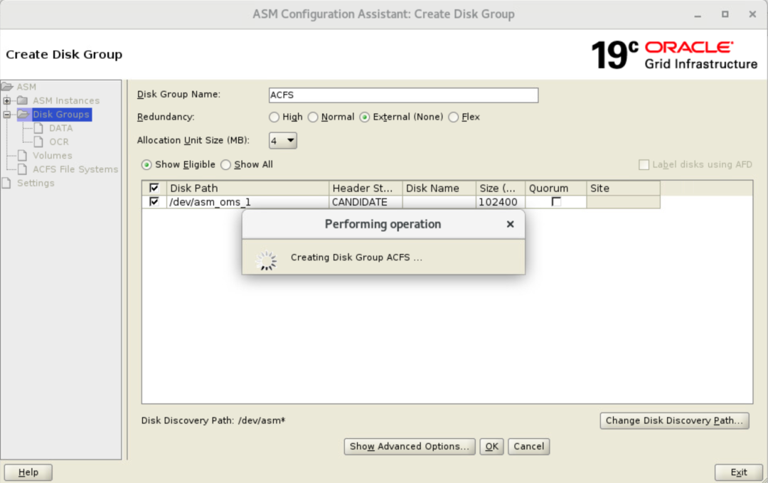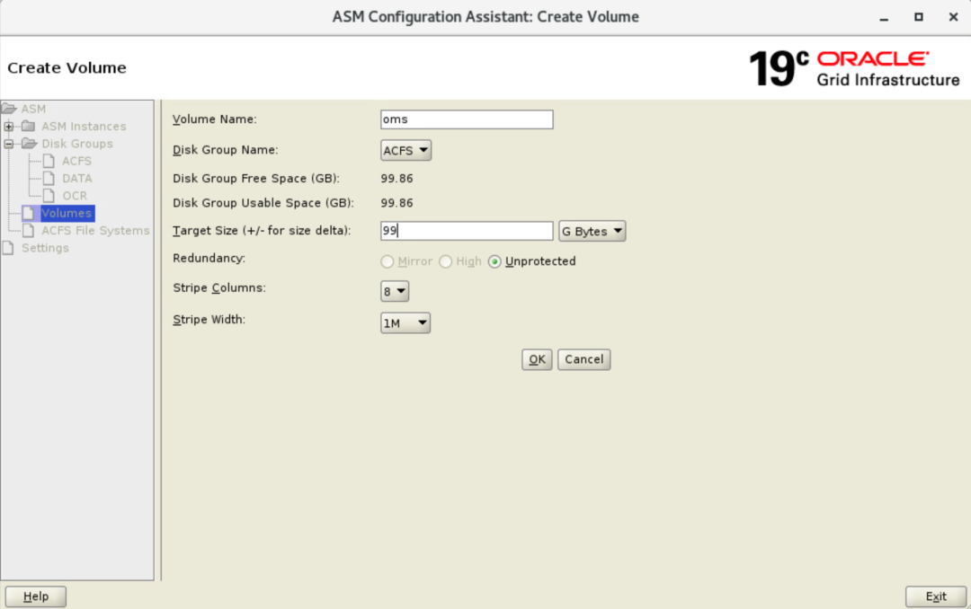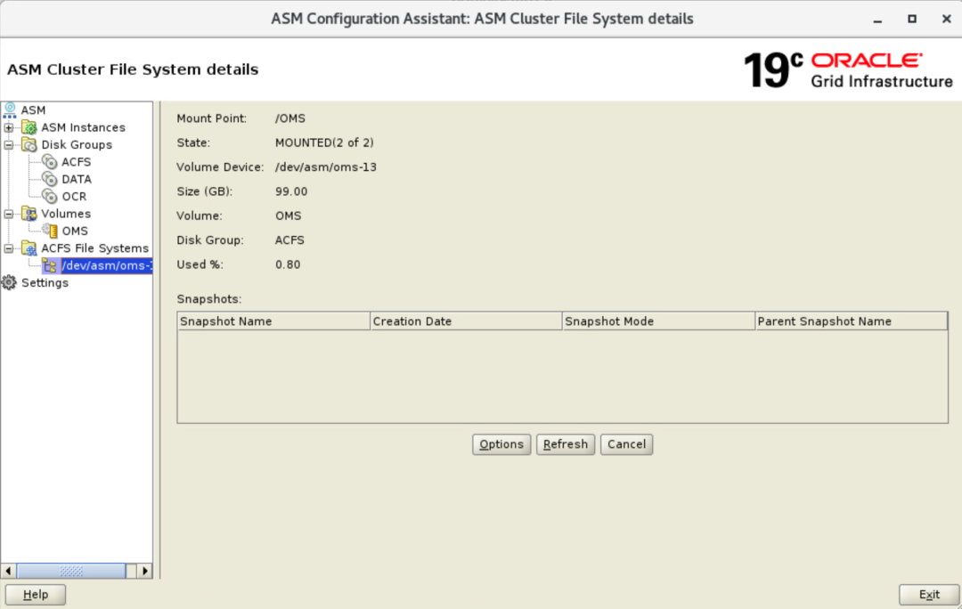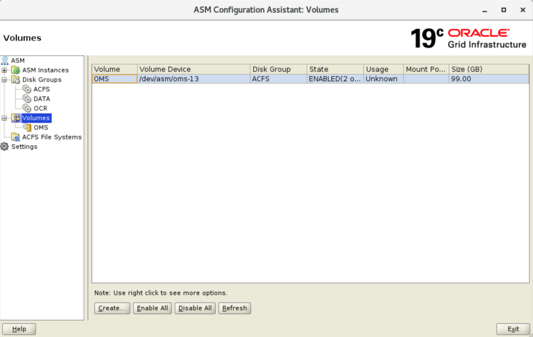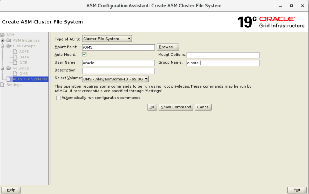 为实现 OMS 的高可用性,需要创建 ACFS(ASM Cluster File System)共享文件系统来存储 OMS 软件和配置文件。