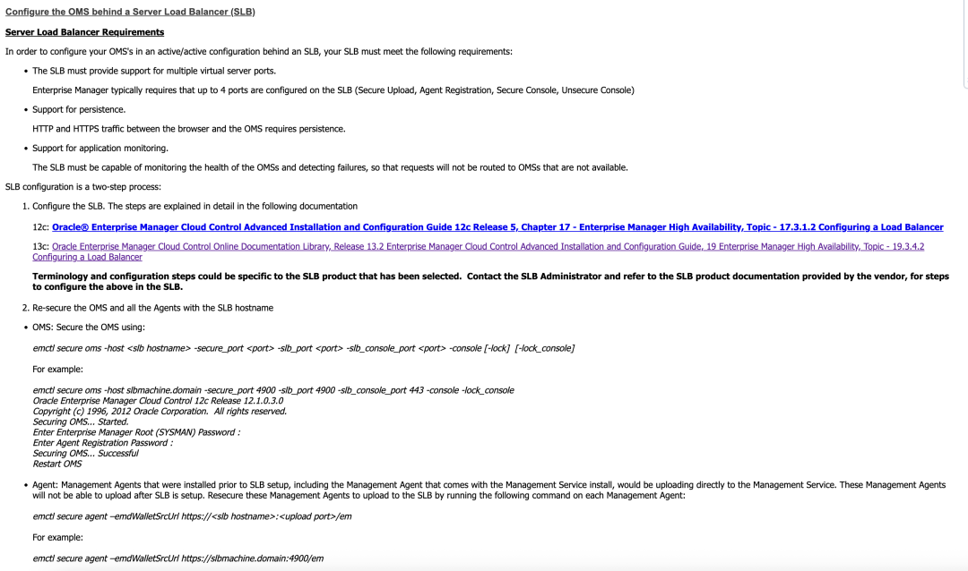 How To Configure Enterprise Manager for High Availability (Doc ID 330072.1) EM 12c ,13c : Steps to Install and Configure Multiple OMS Behind a Server Load Balancer (SLB) (Doc ID 1369698.1) OEMCC 13.2 集群版本安装部署 - Alfred Zhao