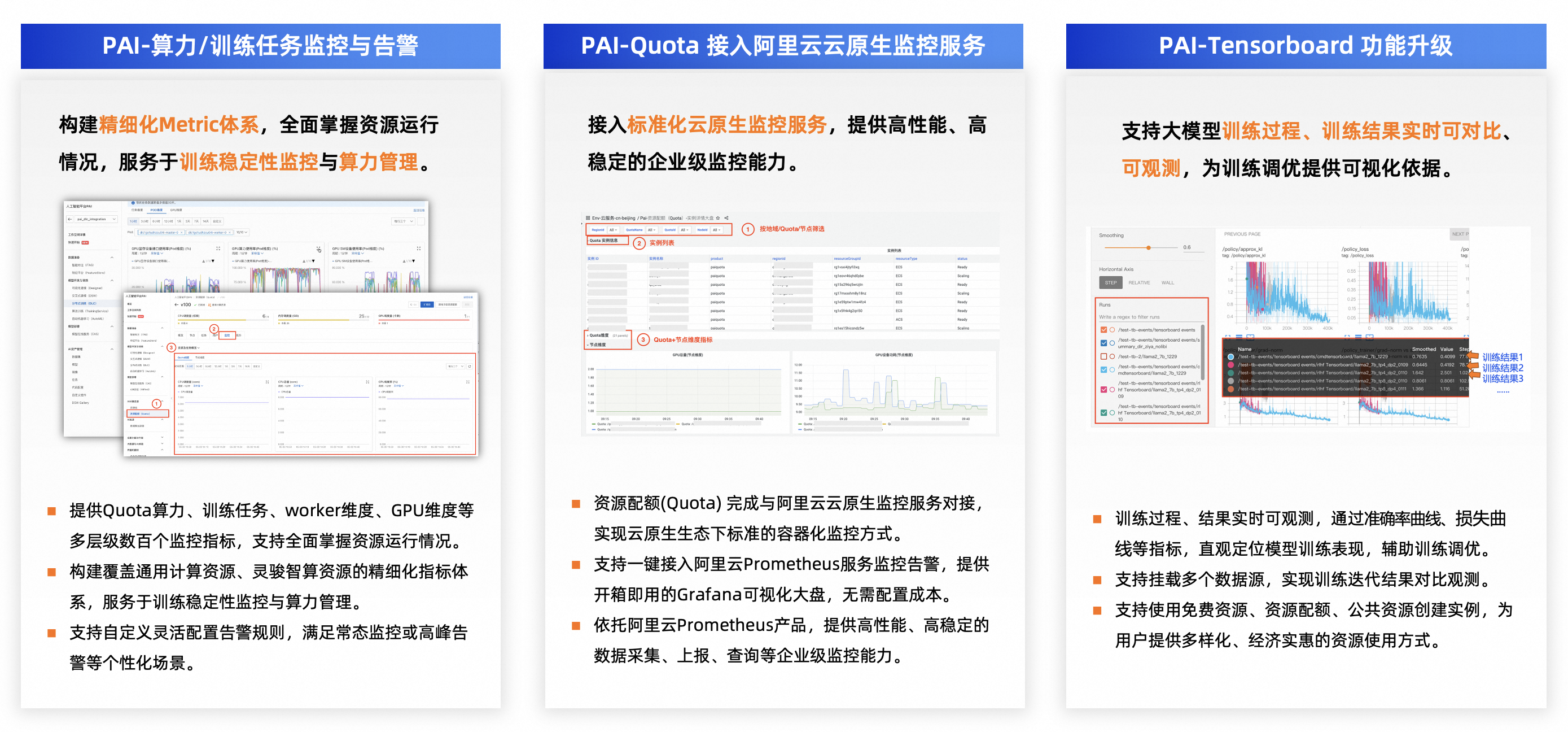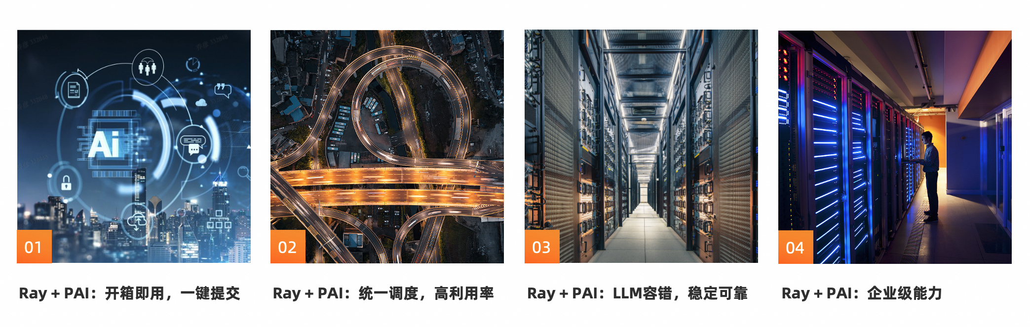 • 可观测:构建覆盖多资源类型的精细化Metric体系,为训练稳定性监控、训练调优、算力管理等场景,提供可视化数据支撑。提供 任务、POD、卡等多维度,数百个监控指标,支持Ray Dashboard, 并且对接云监控和ARMS, 满足客户云上多样的可观测需求。