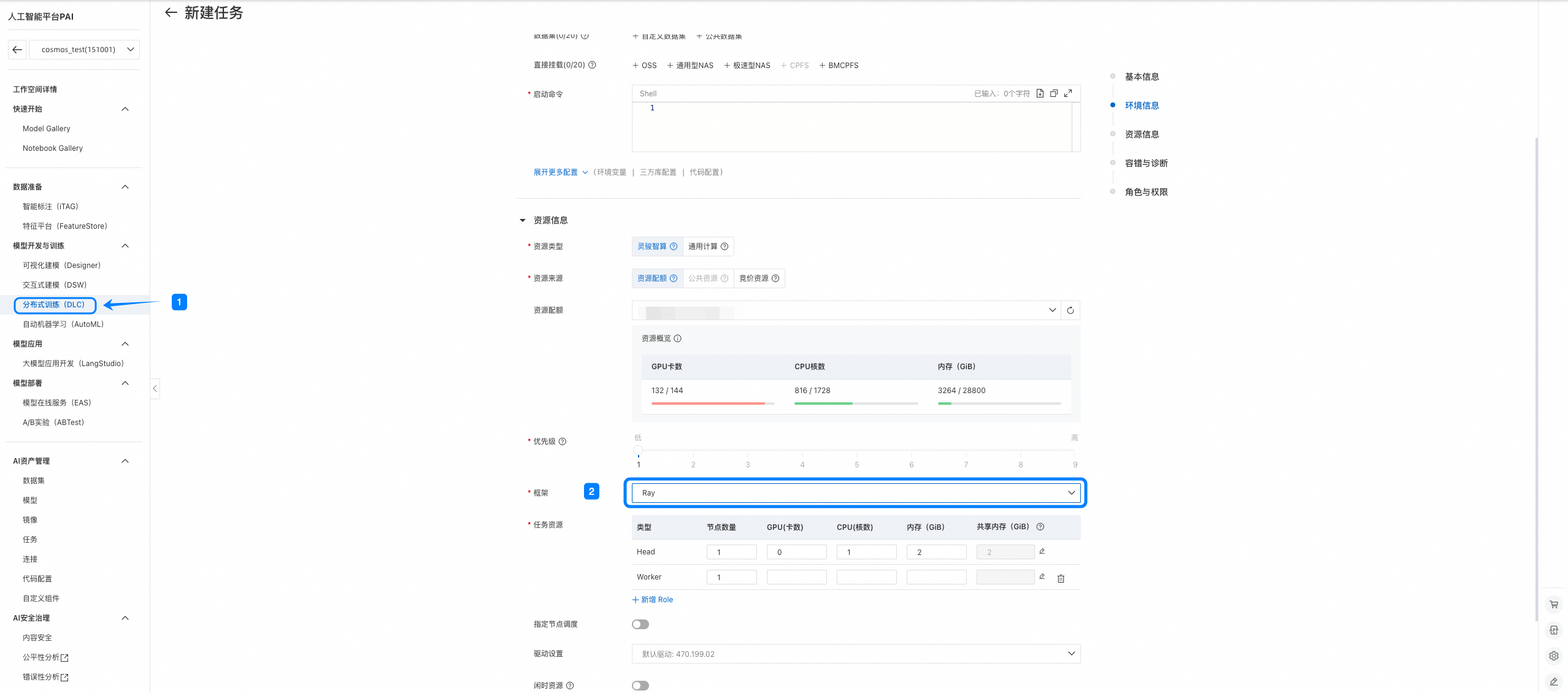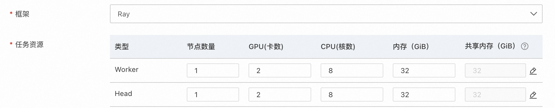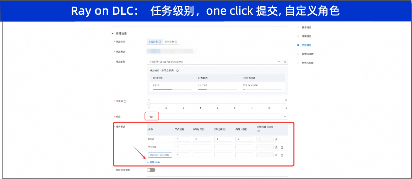 选择 Ray 框架,并配置 head 和 worker 资源