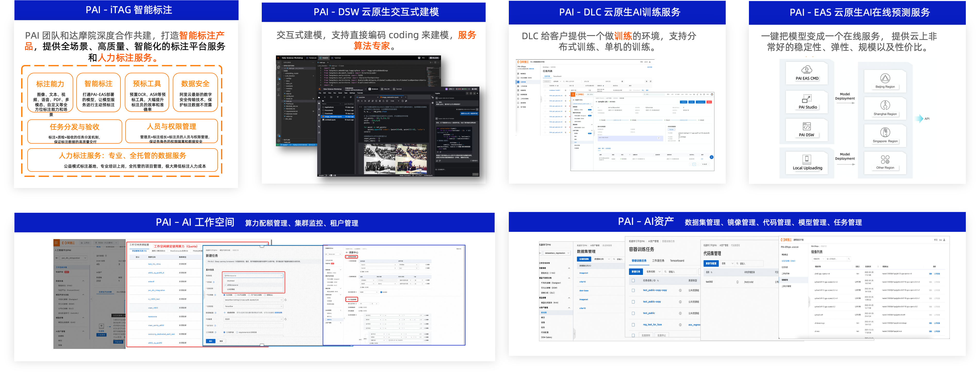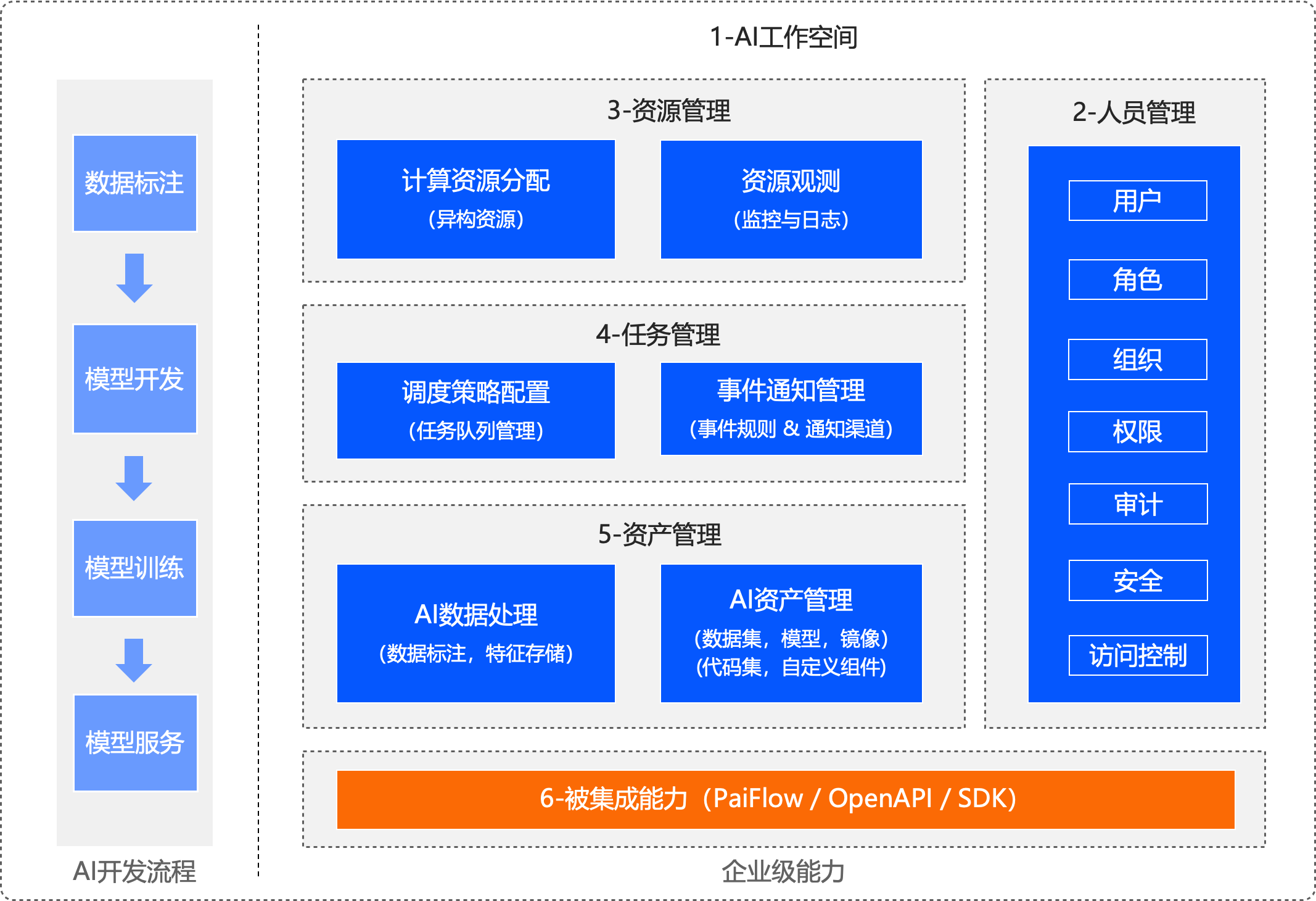 针对大型客户,PAI提供完整的企业级能力,实现AI算力、AI任务、AI资产、AI数据的可管可控,具体来说: