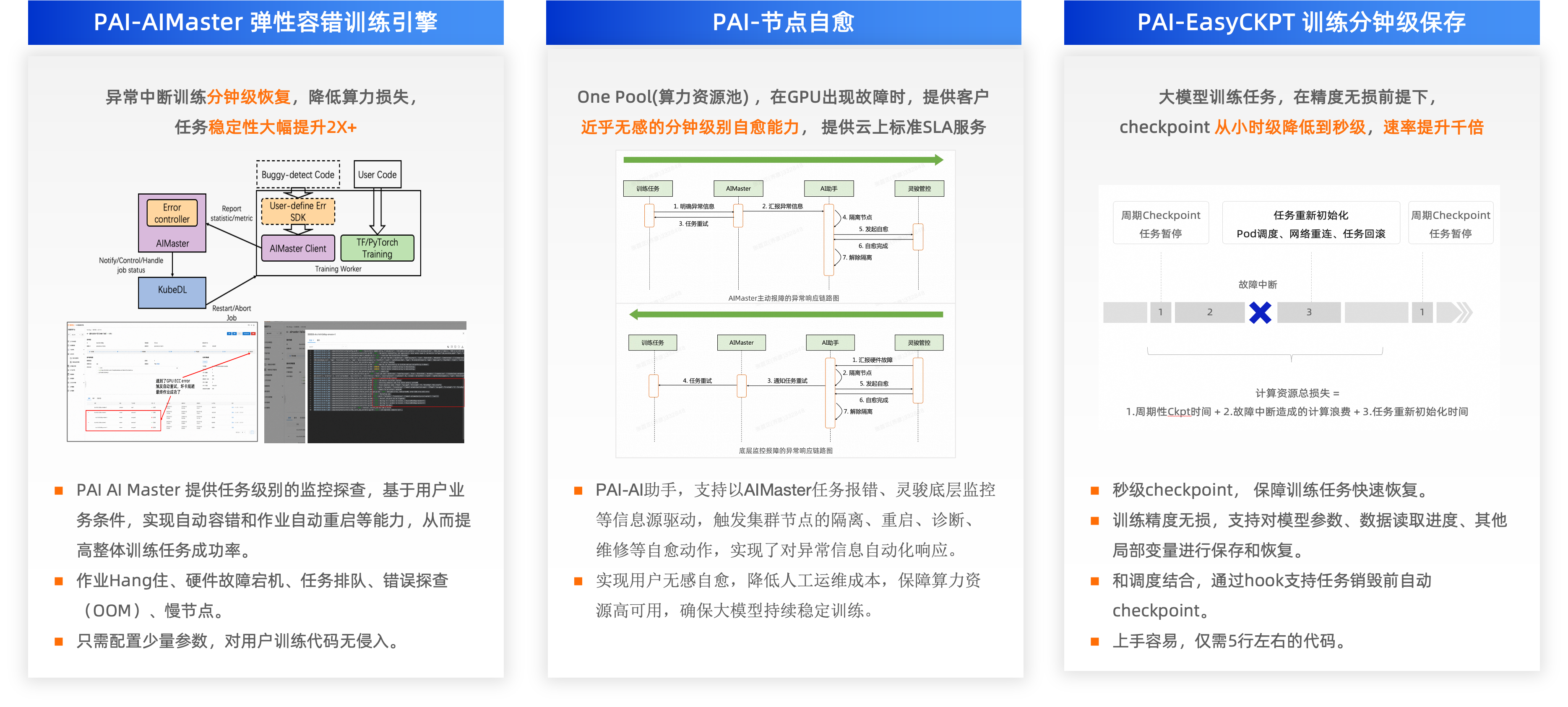 •高可用:通过AIMaster弹性容错引擎、 节点自愈引擎和 EasyCKPT 大模型CKPT引擎, 实现故障节点分钟级自愈,任务分钟级恢复、CKPT秒级保存, 保障Ray任务持续运行, 有效降低人力和避免算力的浪费