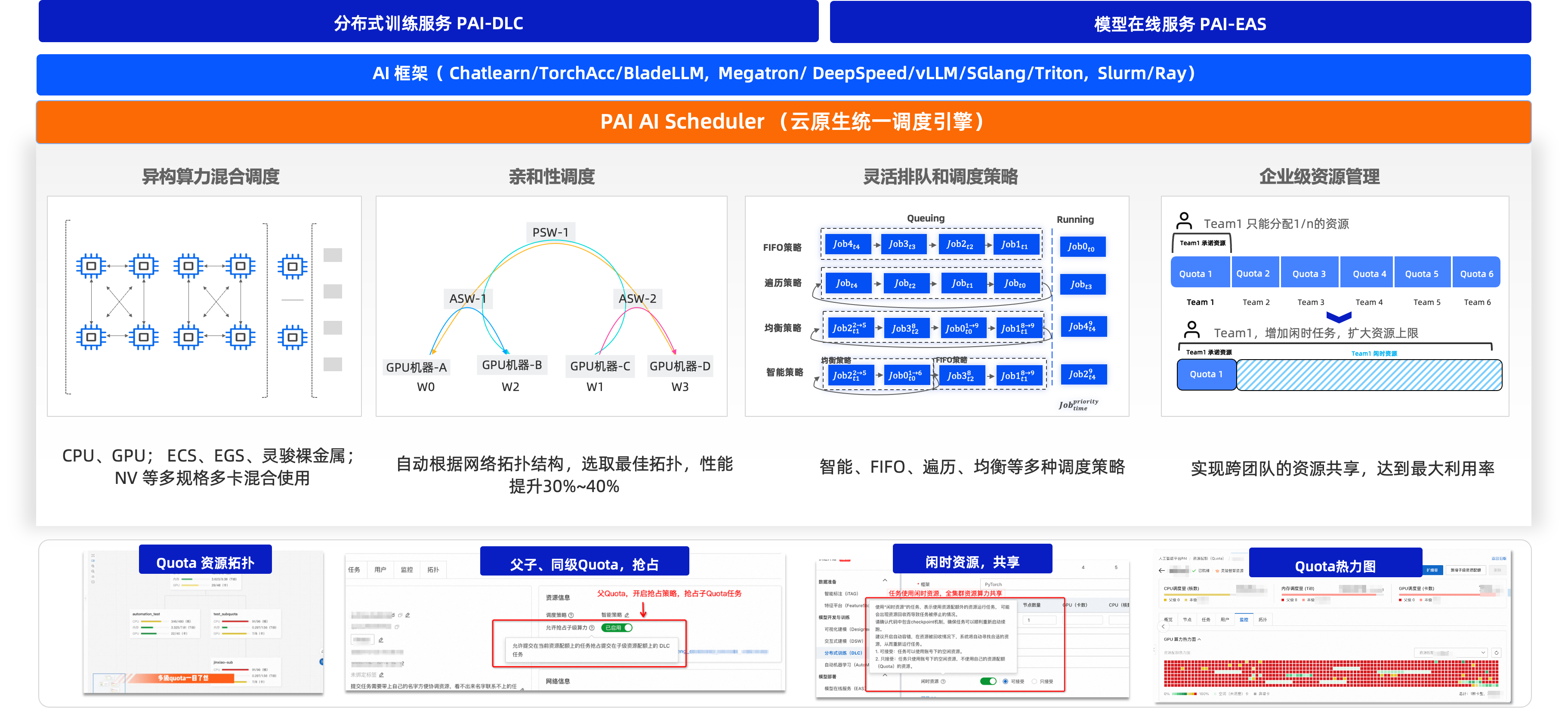在PAI DLC 上提交Ray任务, 将完整享受PAI 统一调度引擎能力,包括自动支持网络拓扑感知、算力拓扑感知,智能、FIFO、遍历、均衡排队策略, 多级Quota的共享、抢占调度机制, 最终实现集群90%+的算力利用率。