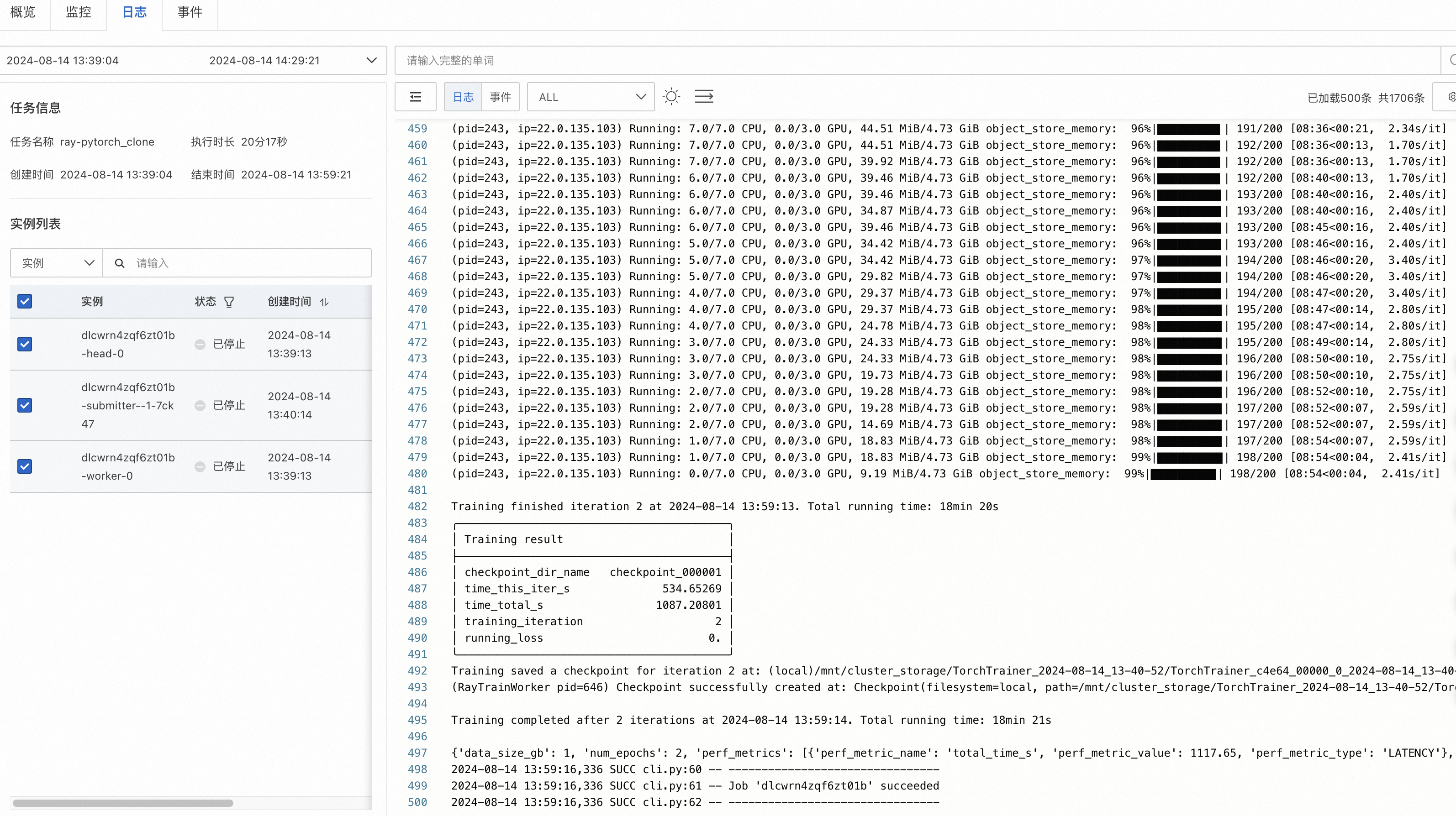 除此以外,每个 Ray 任务 DLC 会自动生成一个 Submitter 节点用于执行任务启动命令,同时用户可以通过 Submitter 节点的日志来浏览查看提交的 Ray 任务日志。在预付费任务中,该节点会共享占用极小部分用户资源用于启动任务;而在后付费任务中,会生成一个最小可用的资源类型节点。