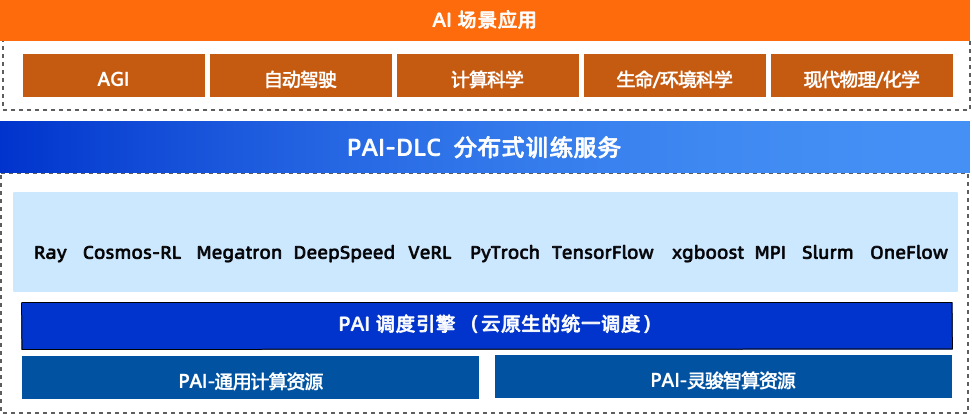 除了Ray,PAI DLC 还支持 Megatron、Deepspeed、Pytorch、MPI、Slurm 等10+业内主流AI训练框架,使用PAI DLC, 意味着一份算力,可以运行Ray任务,也可以一键提交其他任务,随时在多种AI场景切换和使用。