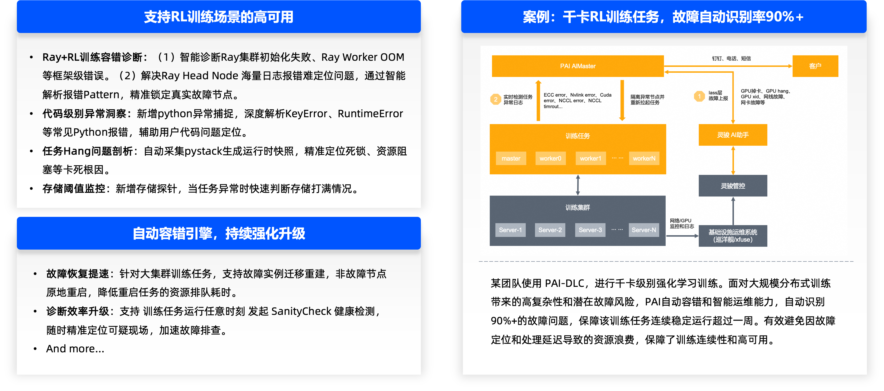 • RayNative的容错机制:针对Ray框架,按照应用层面和系统层,分别提供优化容错机制,全面提升容错能力。支持某大模型团队,多个千卡RL任务,故障识别率90%+,Ray的RL训练任务稳定运行超过一周(RL 任务pattern:千卡规模 x 运行几天)