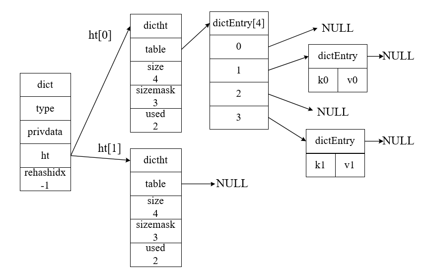 除了ht[1]之外,另一个和rehash有关的属性就是rehashidx,它记录了rehash目前的进度,如果目前没有在进行rehash,那么它的值为-1。一个普通状态下的字典(没有进行rehash)如下图所示: