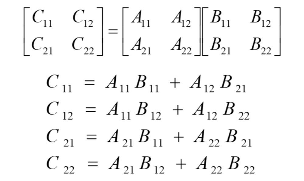 与整数乘法类似,可以将矩阵A,B和C中每一矩阵都分块成4个大小相等的子矩阵