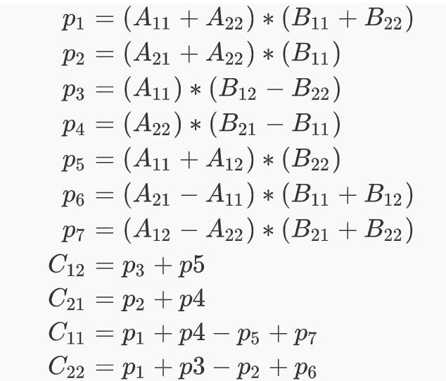 StrassenAlgorithm(AResult, BResult, P7, Divide); // p7 = (a12-a22) * (b21+b22)