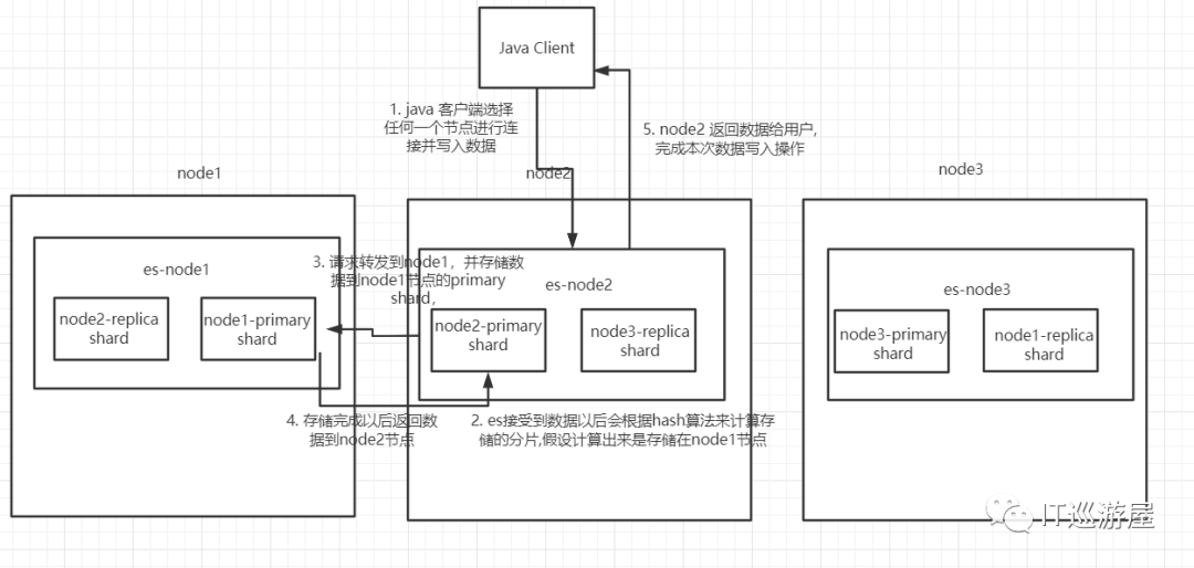 有了上面的基础环境以后,如果我们有一个java的客户端想写入一个数据到es,那么他会如何进行数据写入呢?