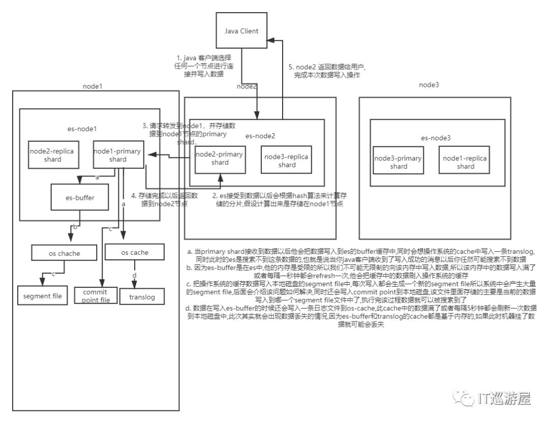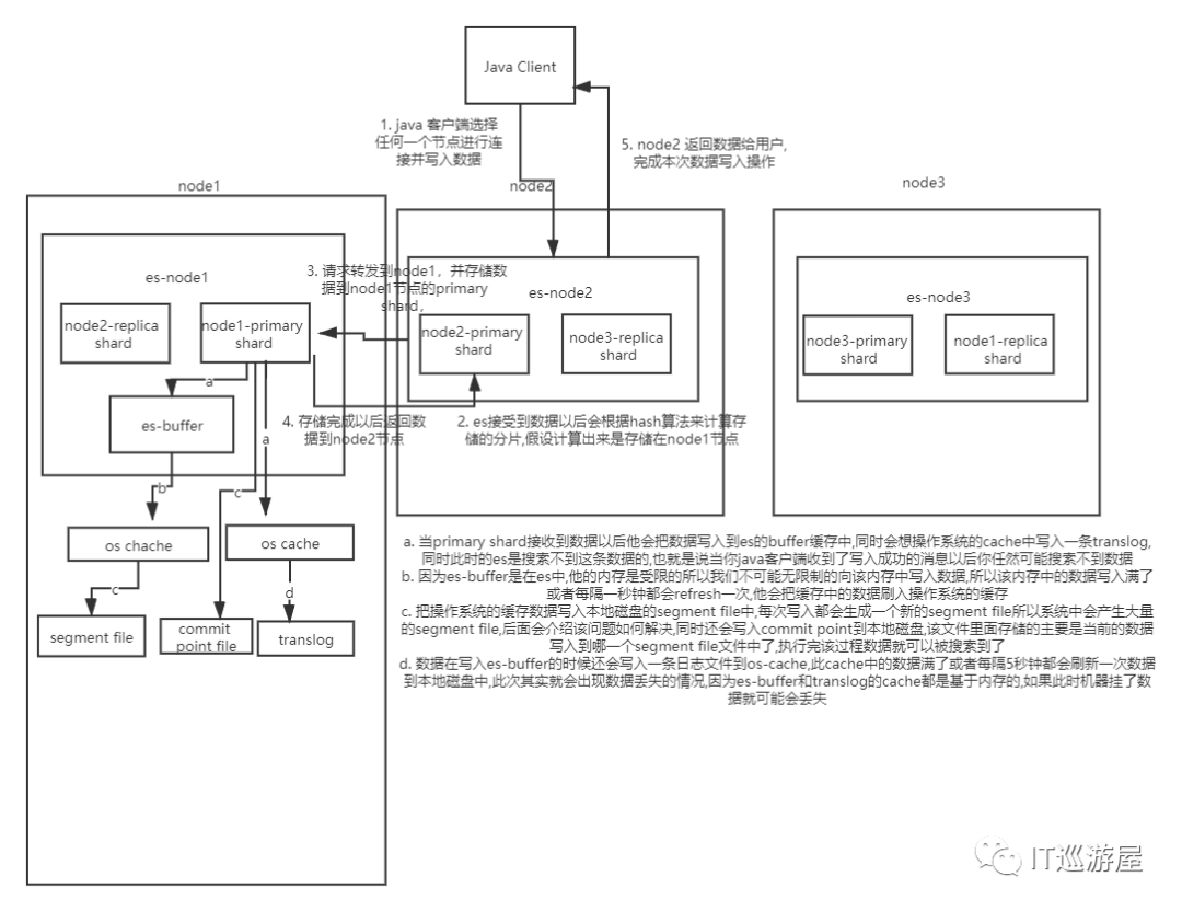 a. 当primary shard接收到数据以后他会把数据写入到es的buffer缓存中,同时会向操作系统的cache中写入一条translog,同时此时的es是搜索不到这条数据的,也就是说当你java客户端收到了写入成功的消息以后你仍然可能搜索不到数据