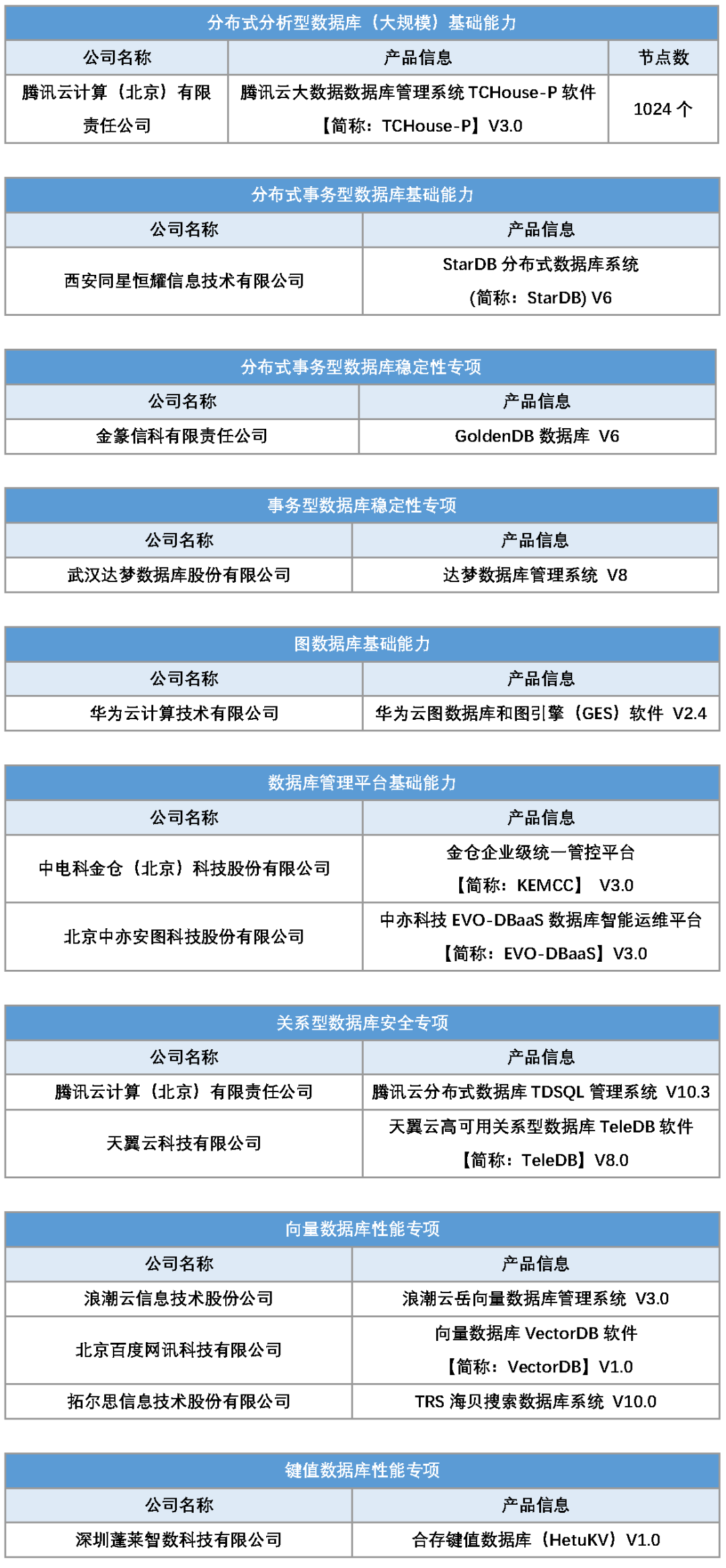 本次通过分布式数据库运维管理能力成熟度模型评估的包括2家用户单位;通过数据库服务能力成熟度模型-运维运营专项评估的包括1家数据库服务提供方;通过数据库服务能力成熟度模型-规划设计专项评估的包括1家数据库服务提供方;通过SQL质量管理平台分级基础能力评估的包括1家数据库服务提供方;通过基础能力测试的包括1款数据库运维智能体、4款向量数据库、1款多模数据库、1款基于AI大模型的数据库开发管理工具、2款防篡改数据库、2款时序数据库、1款全密态数据库、1款事务分析混合型(HTAP)数据库、1款分布式分析型数据库(大规模)、1款分布式事务型数据库、1款图数据库、2款数据库管理平台;通过关系型数据库安全专项测试的包括2款关系型数据库;通过性能专项测试的包括3款向量数据库、1款键值数据库;通过稳定性专项测试的包括1款分布式事务型数据库、1款事务型数据库。