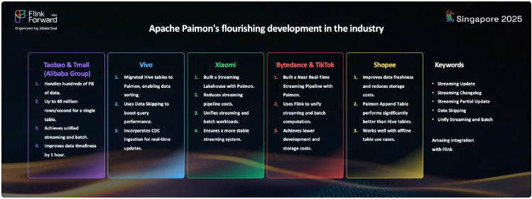 Apache Paimon PMC 主席、Apache Flink PMC 成员李劲松分享了 Apache Paimon 的最新进展。Paimon 是一个流批一体的存储系统,与 Flink 结合构建Streaming Lakehouse 架构。在生态兼容方面,得益于 Iceberg V3发布的 Deletion Vectors 能力,用户可以将 Iceberg 数据通过 Snapshots 实时同步到 Paimon,并保证分钟级别的查询延时。同时面向 AI 时代的多模态数据存储,Paimon 集成了 Lance 文件格式,创新设计支持大体积 Blob(二进制大对象)的高效存储,完美适配音视频等非结构化数据场景。在列文件的随机访问、添加列数据方便也具有极强的性能。Paimon 已经实现广泛的应用,在阿里巴巴集团内部,Paimon 处理了数百 PB 量级的数据,单表每秒处理高达 4000 万行,实现了数据及时性提升一小时的目标。此外,Paimon 还成功应用于 vivo、小米、字节跳动和 Shopee 等企业,展示了其在实时数据湖和多模态数据存储的强大能力。