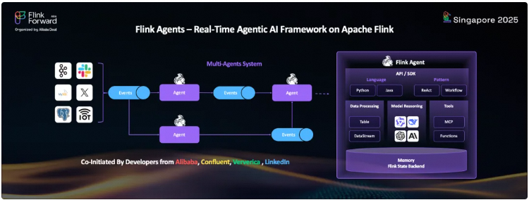 为此,Apache Flink 社区正式发起全新的子项目 Flink Agents。Flink Agents 是专为事件驱动型的 AI 智能体(System-Triggered Agent)打造的 Agent 编程框架。依托于 Flink 流式引擎内核,Flink Agents 天然具备大规模、分布式、实时数据处理能力,以及成熟的状态管理、一致性保障与容错恢复能力,在此基础上,Flink Agents 提供了开发 Agentic AI 系统所必需的 LLM、Memory、Tool、Prompt 等关键概念的封装,以及动态执行计划、循环执行、共享状态、可观测性等能力。目前,Flink Agents 项目正由阿里云、Confluent、Ververica、LinkedIn 等团队联合贡献,将于今年 9 月左右发布首个 MVP 版本。