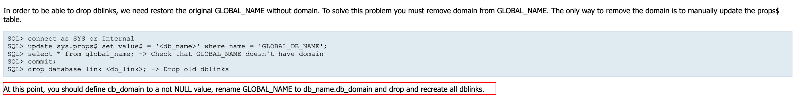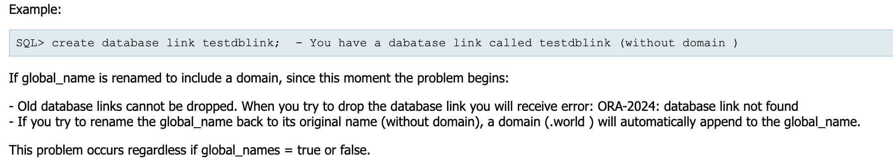 问题:明明存在名为 LUCIFER 的 DBLink (dba_db_links 可查),却无法删除,提示不存在!为什么删不掉? 搜了下 MOS,有一篇文档 DB Parameters - Global Database Name (GLOBAL_DB_NAME) (Doc ID 2643771.1) 比较符合: