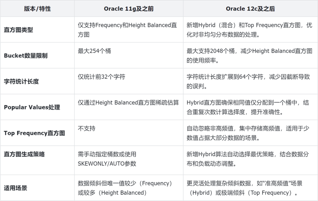 Oracle 最早在7.3版本引入直方图,但直到 Oracle 8i 版本后才逐渐成熟并广泛使用。下表以作为常见的11g版本为分界,对比总结了之前与之后直方图的功能演进。从下面这一表格中可见直方图的发展策略,一方面是支持更为多样的直方图类型,一方面是增加桶数,满足更为精准的数据描述,还有就是在文本处理、生成策略等方面的改进。这些也指导了国产数据库对直方图能力的支持。