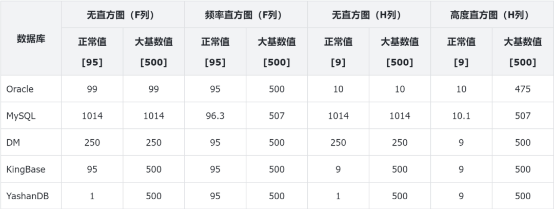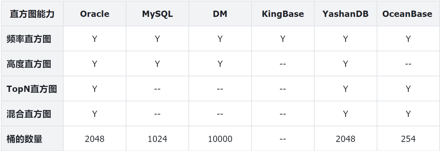 下面列举了几种常见的国产数据库直方图的能力,并与Oracle、MySQL加以比较。初步感觉,各国产数据库都支持了直方图能力,但支持范围不同,有些支持更全面些。此外,很多国产数据库都将直方图能力作为缺省的统计信息来收集,这点与Oracle 11g不同。