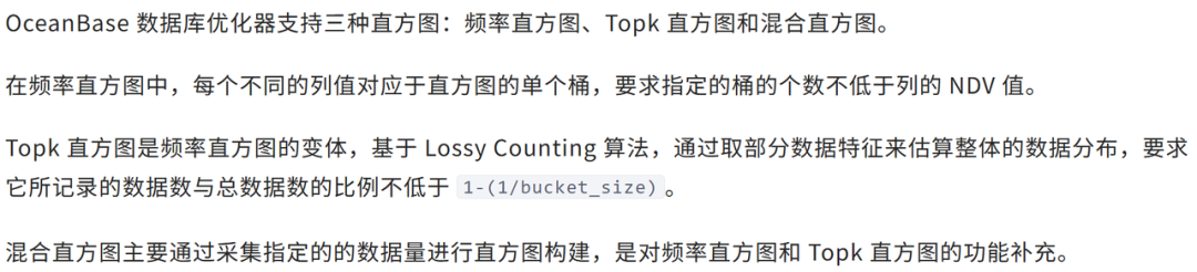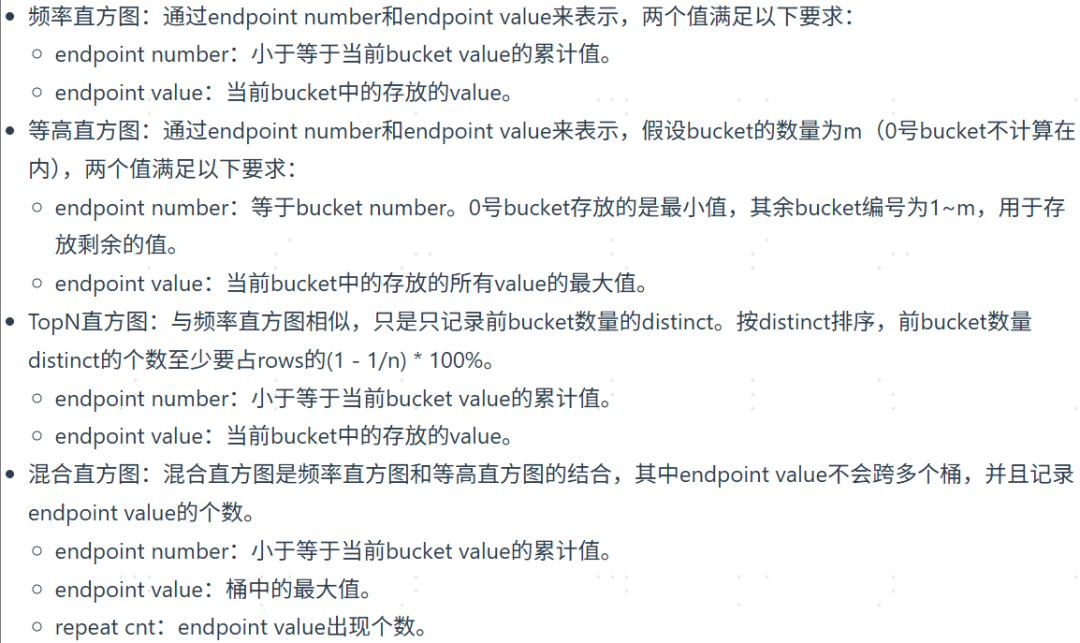 WITH N BUCKETS)不小于列的唯一值数量时,生成等宽直方图;否则生成等高直方图。