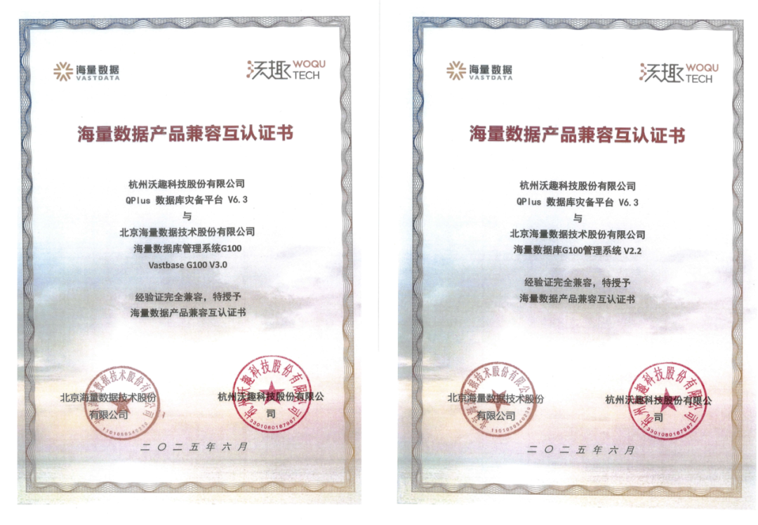 近日,杭州沃趣科技股份有限公司与北京海量数据技术股份有限公司正式宣布,双方核心产品已完成兼容性互认测试。测试结果表明,沃趣 QPlus 数据库灾备平台 V6.3 与海量数据库管理系统 Vastbase G100 V3.0/V2.2 完全兼容,运行稳定,性能卓越。