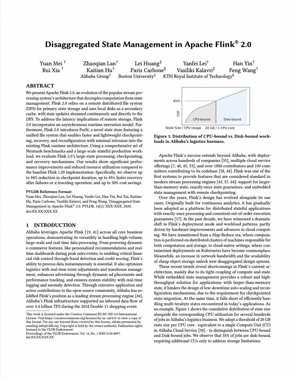 热烈祝贺 Apache Flink 2.0 的重磅研究成果《Disaggregated State Management in Apache Flink® 2.0 》被数据库领域顶级会议 VLDB 2025 正式接收!这项工作由 Apache Flink 社区 联合 阿里巴巴实时计算 Flink 团队 以及多位学术界研究人员共同完成,从架构上根本解决了在存算一体架构下长久以来快照消耗大、状态恢复慢,以及状态和计算捆绑造成成本高的问题,标志着 Flink 在分布式流处理系统状态管理架构上的重大突破,也代表着 Flink 向云原生架构演进的重要里程碑。
