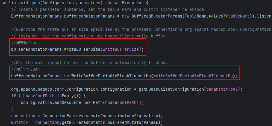 与方案1类似,有些许差别,同样基于BufferedMutator,定时定量的设置方式通过BufferedMutatorParams设置,使用示例代码如图所示: