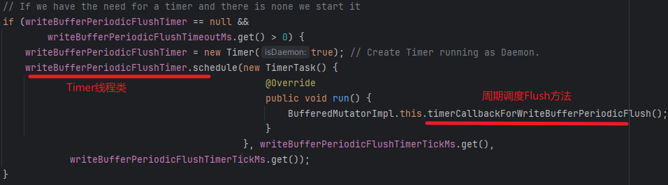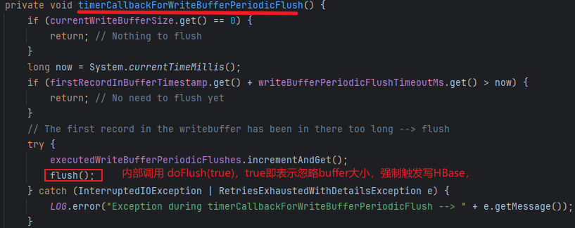 但是定时触发通过BufferedMutatorImpl内置的Timer类型线程writeBufferPeriodicFlushTimer周期调度timerCallbackForWriteBufferPeriodicFlush方法实现,该方法内部调用doFlush(true)强制触发写HBase,相关源码如图所示: