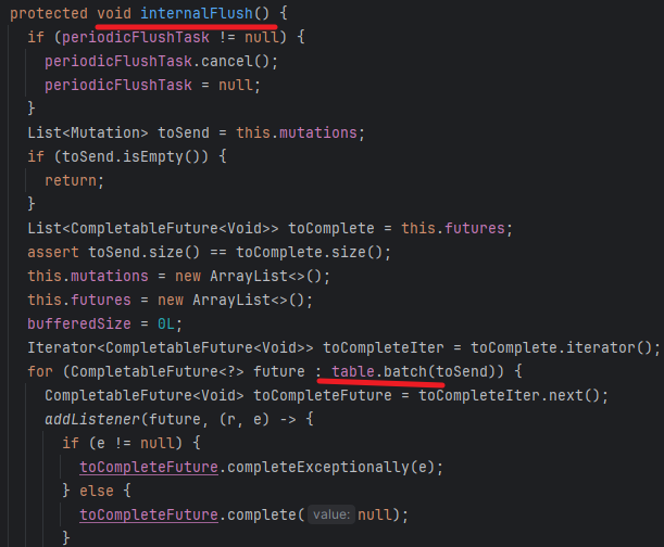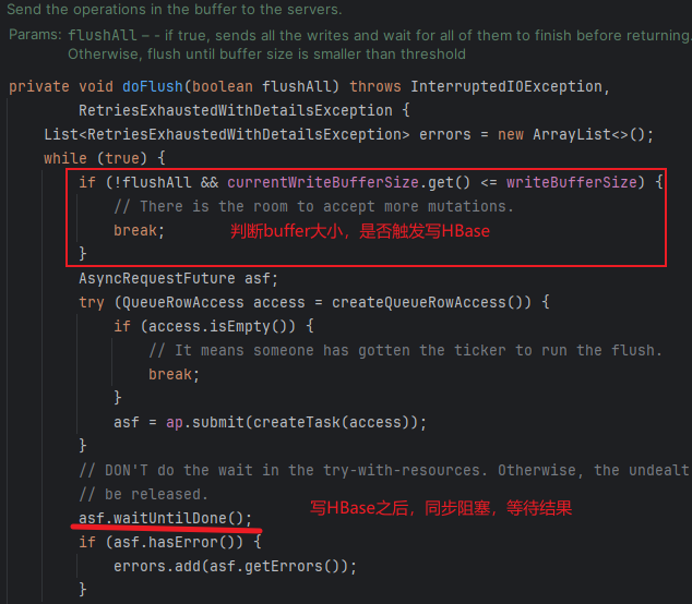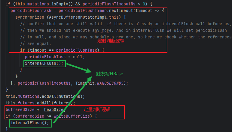 而定量触发就是mutate方法中调用doFlush(false)内部通过判断是否达到buffer大小,以决定是否触发写HBase。而最终定时定量触发机制都通过构建AsyncProcessTask任务,然后同步阻塞等待结果来实现,相关核心源码如图所示: