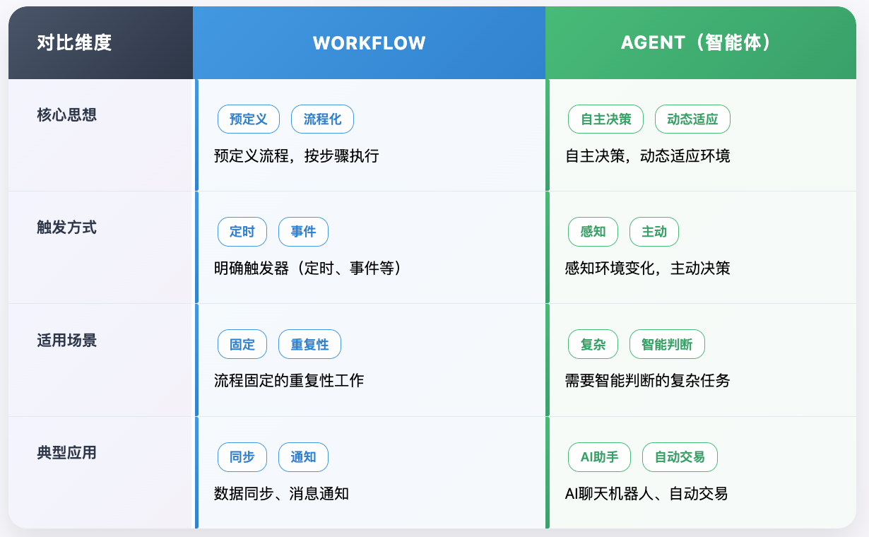 Workflow更像是"自动化脚本",而Agent是"具备智能的自主系统"。对于大多数企业的日常运维和业务流程,workflow已经能解决80%的自动化需求。