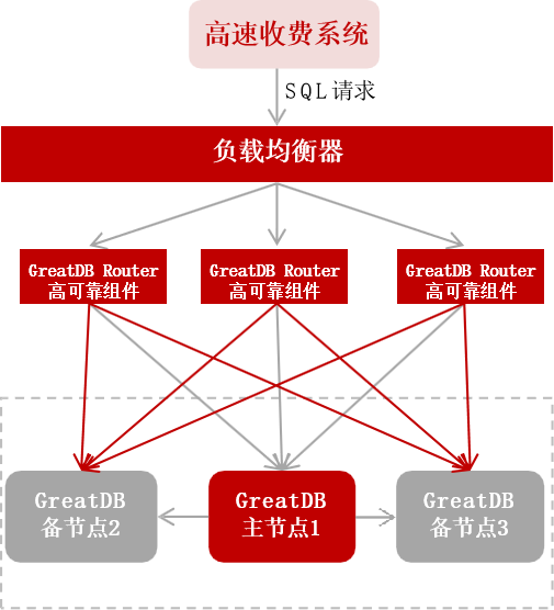 部署多个GreatDB Router,且相互之间独立,实现SQL请求负载均衡和读写请求分别发送到不同节点,支持语句级读写分离;