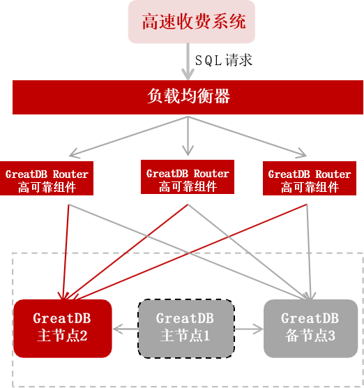 负载均衡器中配置多个GreatDB Router组建IP地址,实现SQL请求均衡分发到数据节点;