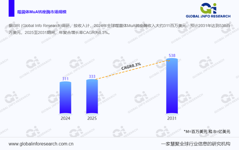 根据拥有超过11年的行业经验的广州环洋市场信息咨询有限公司(Global Info Research)的《2025年全球市场噬菌体MuA转座酶总体规模、主要生产商、主要地区、产品和应用细分研究报告》指出,2024年全球噬菌体MuA转座酶市场收入约为311百万美元,预计到2031年将达到538百万美元,年复合增长率(CAGR)为8.3%。这一增长主要受到生物制药行业快速发展的推动,尤其是疫苗研发和基因编辑技术的广泛应用,进一步带动了对噬菌体MuA转座酶的需求。