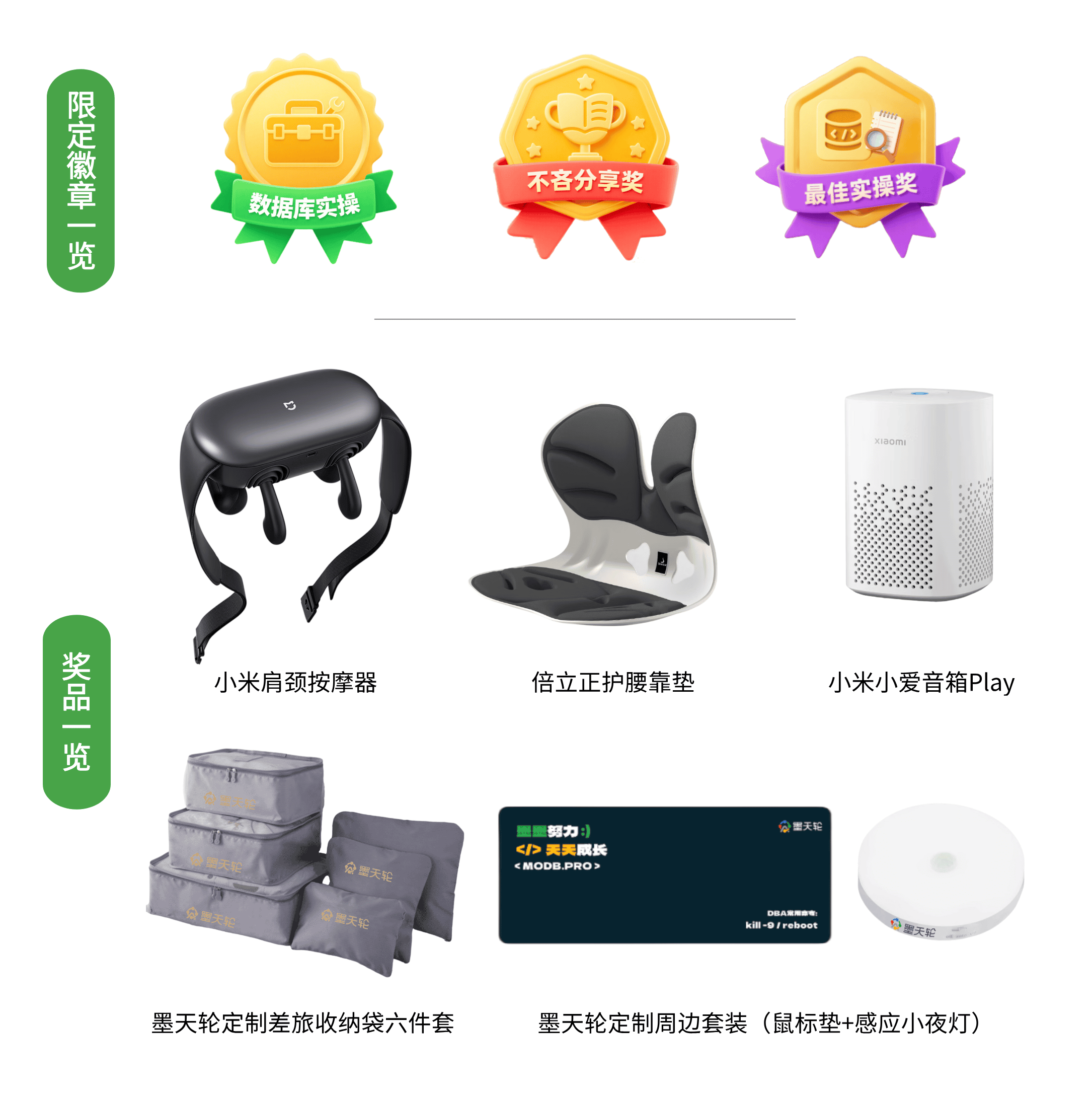 | 最佳实操奖 | 若干篇 | 最佳实操徽章(虚拟)+实物奖品(以下奖品可二选一) 1、墨天轮定制差旅收纳袋六件套 2、墨天轮定制周边套装(鼠标垫+感应小夜灯) |