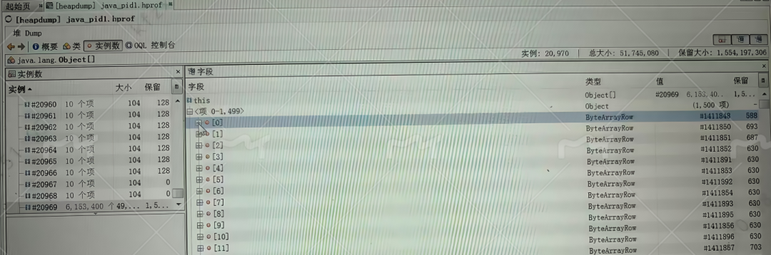 获取dump下来的内存快照后,使用jdk自带的Java visualVM打开后,找到右侧最大的对象: