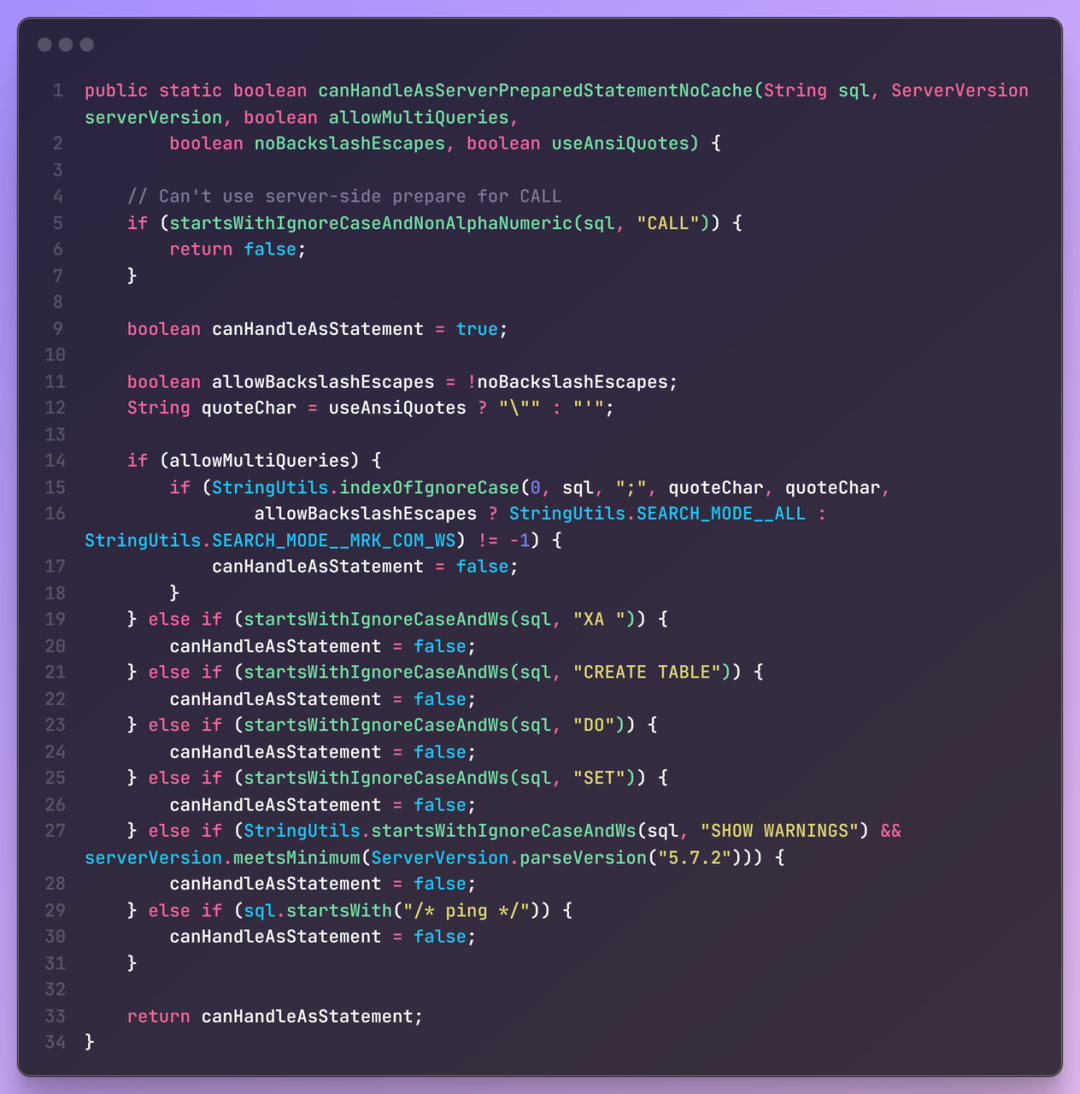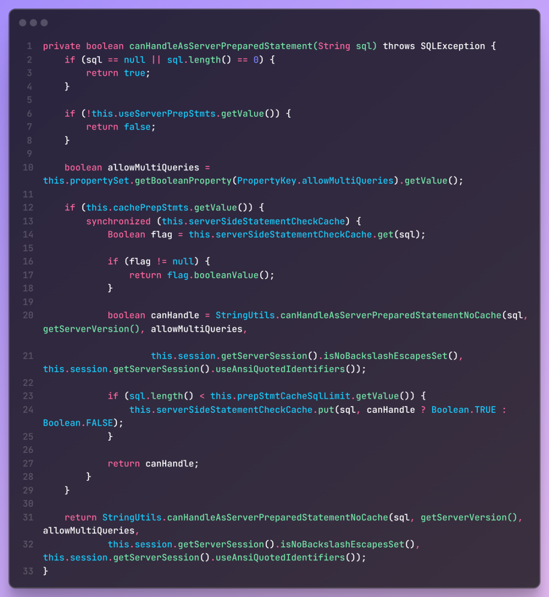 这行的代码意思在sql语句中查找;的位置,忽略''符号之间的内容,如果不存在,即返回-1,就允许使用ServerPreparedStatement