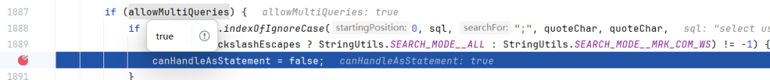 通过debug发现,会走到16行的 canServerPrepare = canHandleAsServerPreparedStatement(nativeSql);