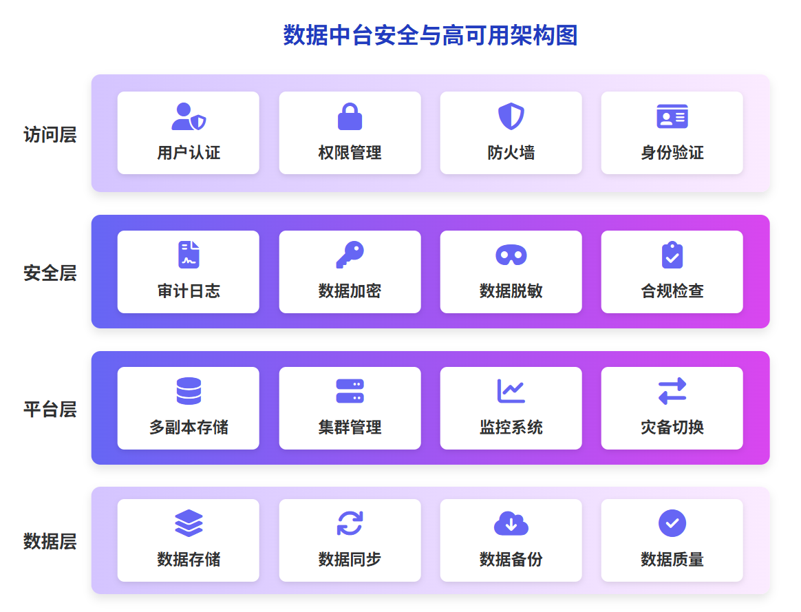 对于承载企业核心数据资产的中台系统,安全性和高可用性是不容忽视的关键指标。这包括完善的权限管理机制、详细的审计日志、数据加密能力,以及高可用部署与灾备方案。