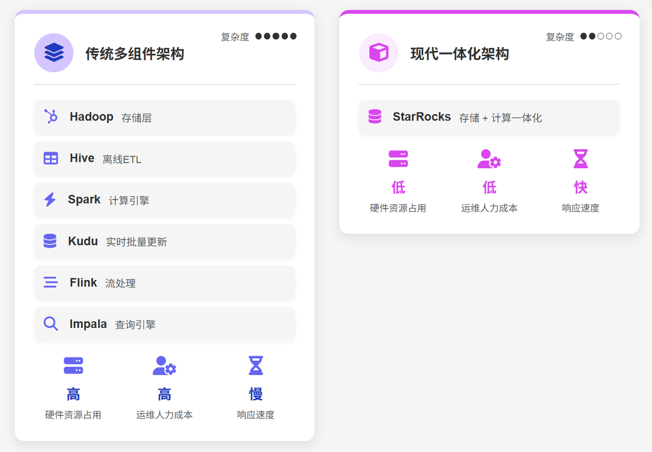 StarRocks 解决了这个问题:对于传统企业来说,我们可以将 Hadoop + Hive + Spark + Kudu + Flink 的功能全部交给 StarRocks,实现存储/流批处理一体化”。这种技术栈的简化不仅降低了资源占用,还大幅减少了维护成本。