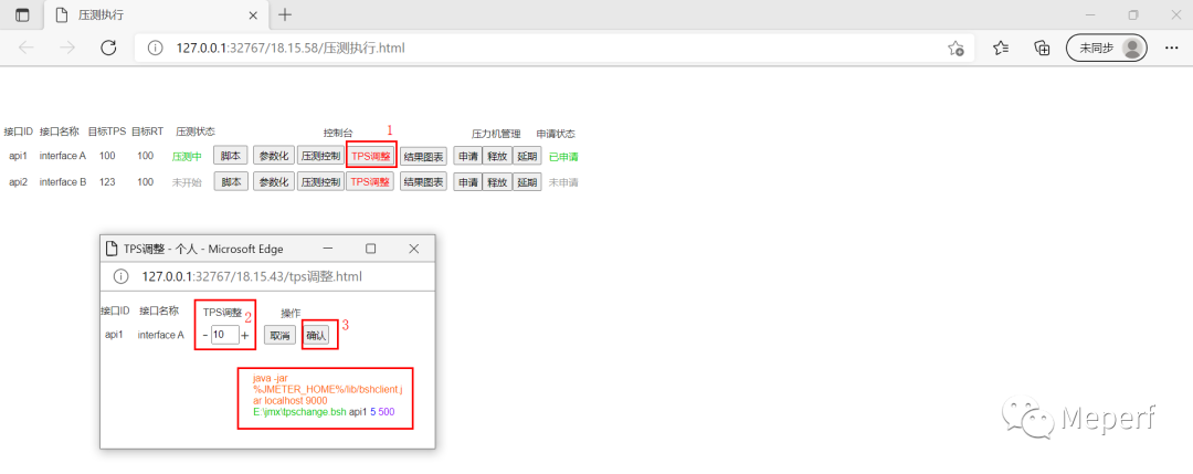 当某个接口进行性能测试,需要调整TPS时只需要点击TPS调整按钮,弹出接口信息以及TPS调整输入框,点击确认(3)后,平台代码调用命令进行TPS动态调整。