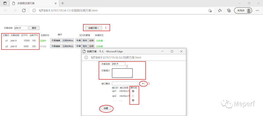 测试方案如何集合同一模块的业务接口(脚本)?本文中初步设计为,类似JMeter GUI模式下,脚本聚合(Merge)操作,用户通过下拉框(下图步骤3)选中需要归类到同一方案中的接口后,点击创建,压测平台自动进行聚合操作生成一个JMX文件,该JMX文件包含了多个线程组,多个接口: