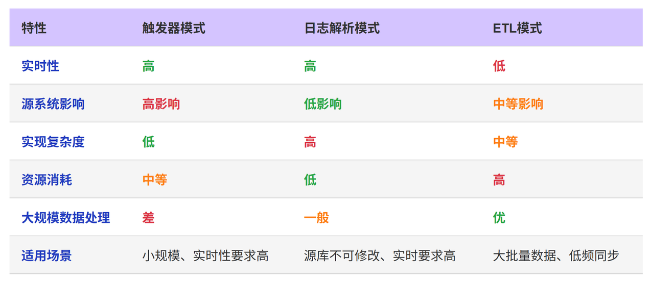 触发器模式:通过在源数据库设置触发器捕获变更,实现简单但可能影响源系统性能