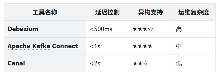 Debezium 具有极低延迟和较好的异构数据库支持能力,但运维复杂度高;Apache Kafka Connect 提供丰富的连接器生态;Canal 运维简单但异构支持相对较弱。