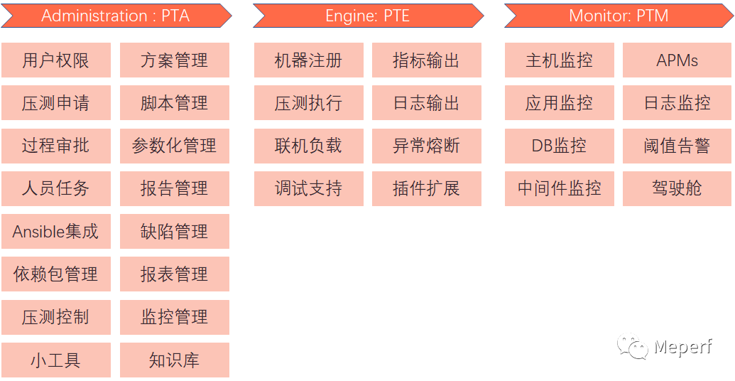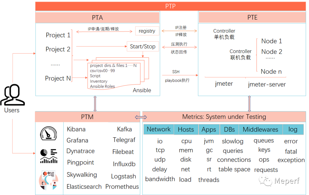 PTE,性能测试引擎作为性能测试平台的核心模块,连接了PTA与PTM。一方面PTA调用PTE进行性能测试压力发起,另一方面PTE的压力体现在被压测系统各监控指标上。