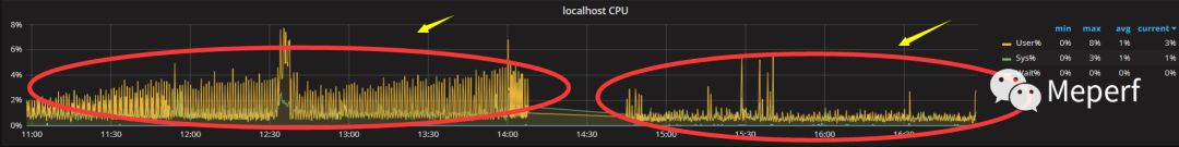 ls -t *.nmon |awk '/\.nmon/ {if (NR >1){system ("rm " $1)}}'控制nmon文件大小之前和之后主机CPU耗用对比图:前半部分没有控制单个nmon文件监控总次数
