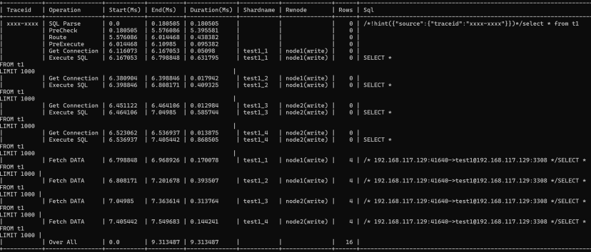 Get Connection | 从分片节点获取连接 | 从数据节点获取物理连接时间,如果时间异常,可检查连接池状态和后端数据节点最大连接数状态 |