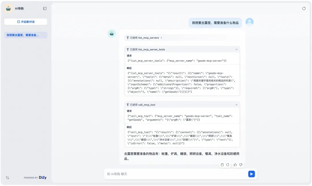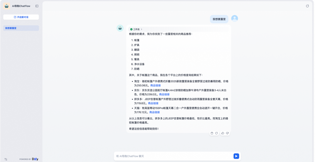 首先,我们调用 AI 导购,希望他给我们一些露营的装备建议: