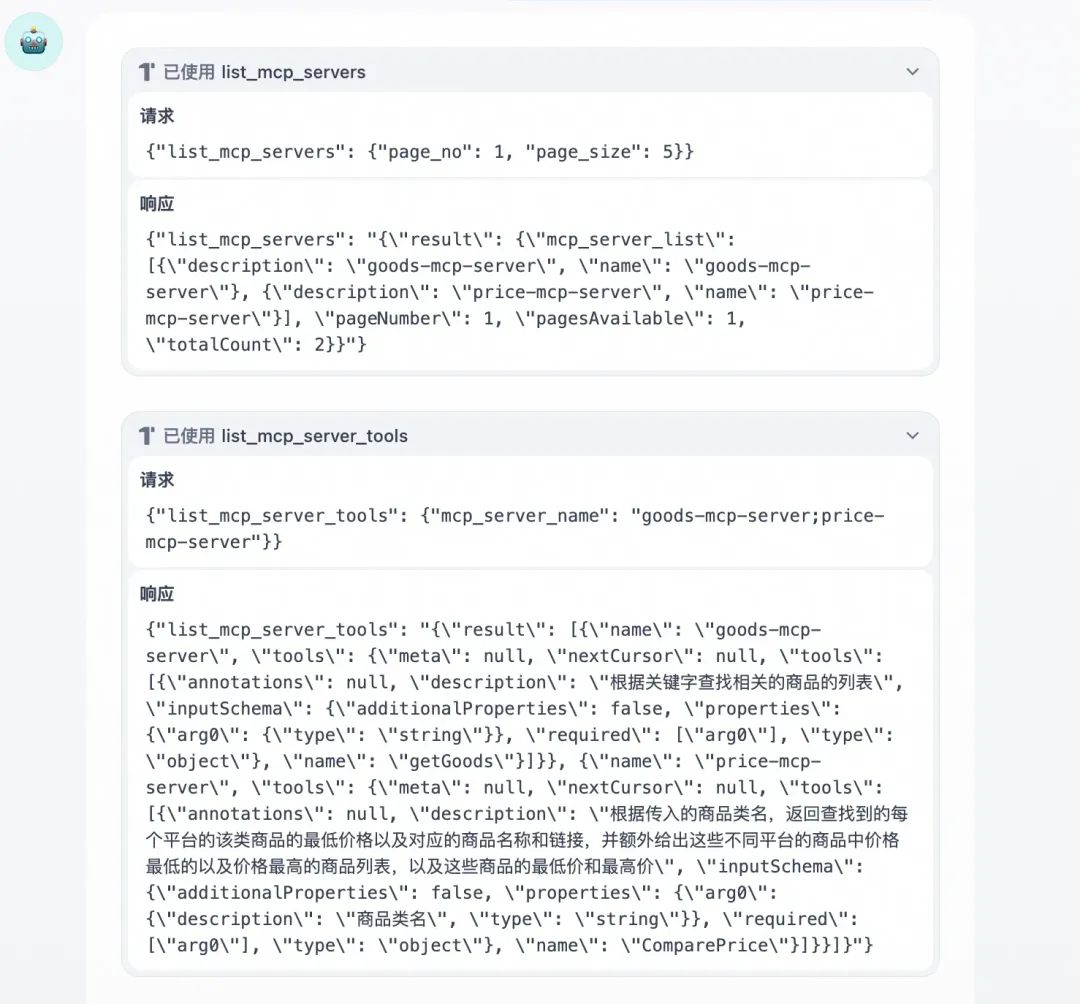 此外,查看模型的工作链路,我们看到模型首先查询了所有可用的 MCP 服务列表,根据任务判断需要调用 goods-mcp-server
